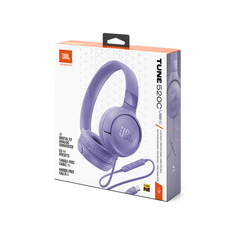JBL Tune 520C USB-C. Type de produit: Casques. Technologie de connectivité: Avec fil. Utilisation recommandée: Appels/Musique. Fréquence des écouteurs: 10 - 40000 Hz. Longueur de câble: 0,2 m. Poids: 150 g. Couleur du produit: Lilas