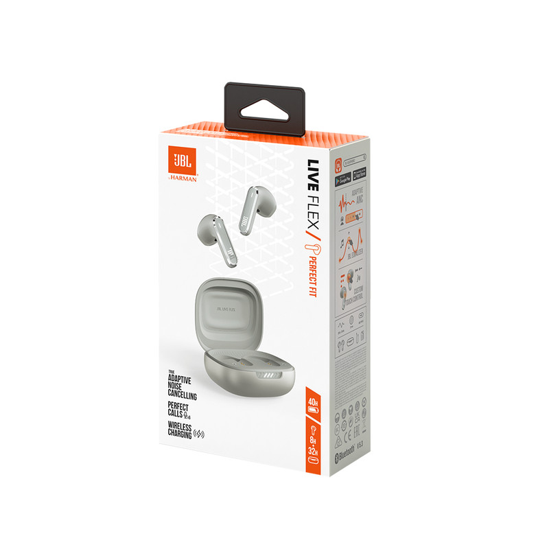 JBL LIVE FLEX. Type de produit: Casque. Technologie de connectivité: Sans fil, Bluetooth. Utilisation recommandée: Appels/Musique. Fréquence des écouteurs: 20 - 2000 Hz. Poids: 37,9 g. Couleur du produit: Argent