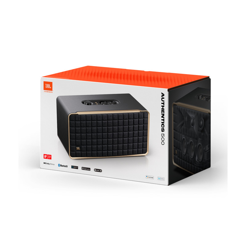 JBL Authentics 500. Utilisation recommandée: Universel. Canaux de sortie audio: 3.1 canaux, Nombre de lecteurs: 7. Technologie de connectivité: Avec fil. Puissance évaluée de RMS: 135 W, Gamme de fréquence: 40 - 20000 Hz. Couleur du produit: Noir, Or