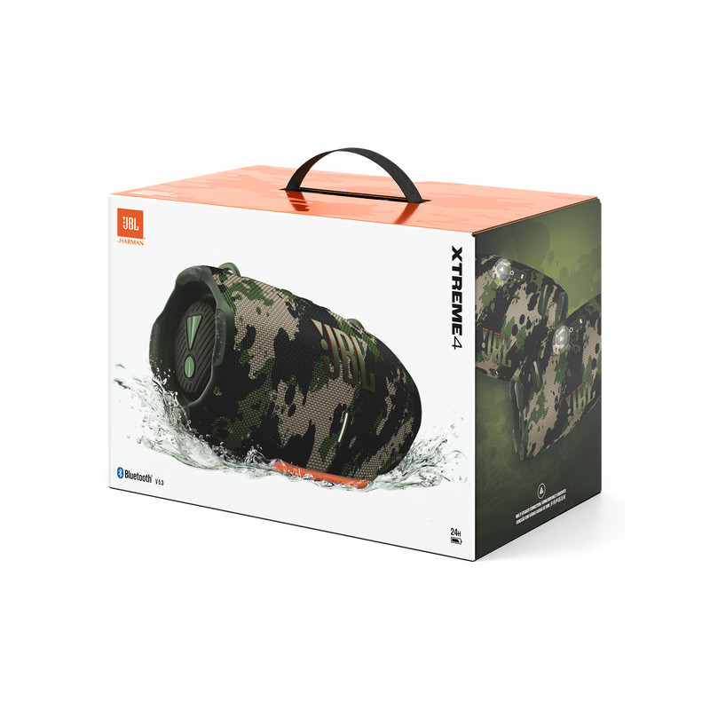 JBL Xtreme 4. Diamètre de haut parleur aigu (impérial): 1,91 cm (0.75"), Diamètre de haut parleur aigu: 2 cm, Diamètre du woofer (impérial): 6,98 cm (2.75"). Puissance évaluée de RMS: 30 W, Puissance en RMS du woofer: 30 W, Puissance en RMS du tweeter: 20 W. Technologie de connectivité: Sans fil, Profils Bluetooth: A2DP, AVRCP, Connecteur USB: USB Type-C. Type de produit: Enceinte portable stéréo, Couleur du produit: Camouflage, Commande de volume: Boutons. Utilisation recommandée: Universel