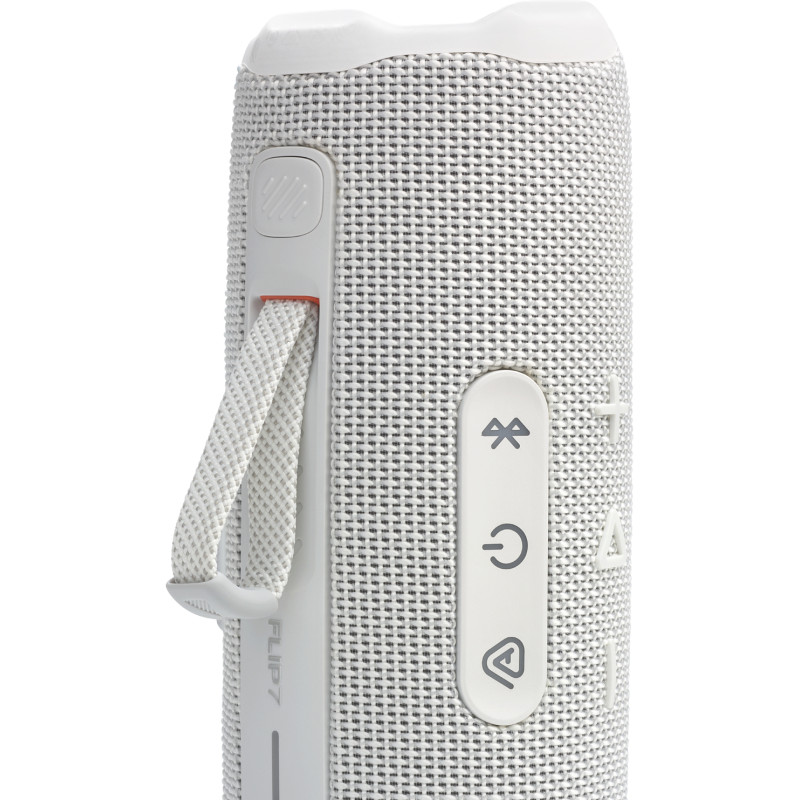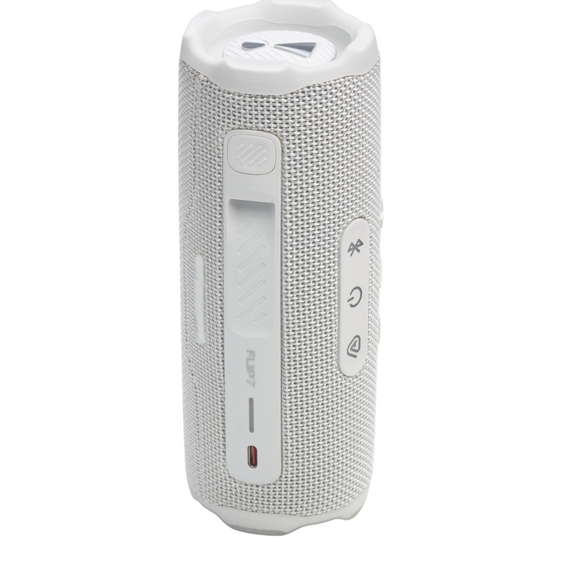 JBL Flip 7. Type d'écouteurs: 2-voies, Diamètre de haut parleur aigu (impérial): 1,52 cm (0.6"), Diamètre de haut parleur aigu: 1,6 cm. Puissance en RMS du woofer: 25 W, Puissance en RMS du tweeter: 10 W, Gamme de fréquence: 60 - 20000 Hz. Technologie de connectivité: Sans fil, Profils Bluetooth: A2DP, AVRCP, Connecteur USB: USB Type-C. Couleur du produit: Blanc, Conception du produit: Cylindre, Commande de volume: Boutons. Utilisation recommandée: Universel