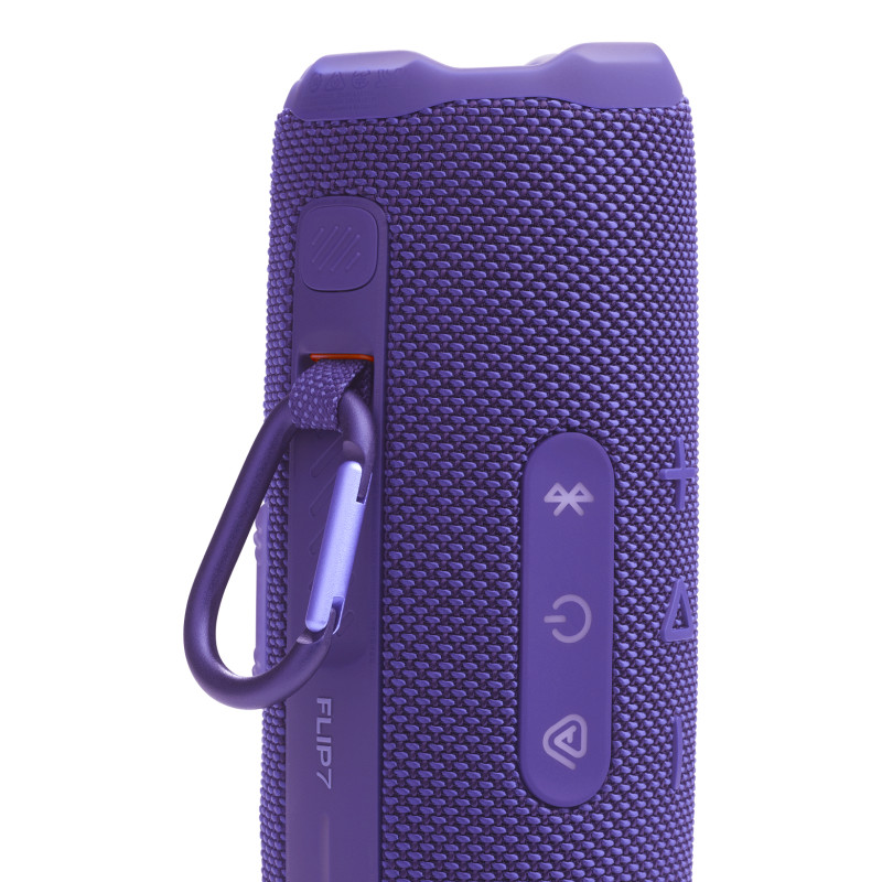 JBL Flip 7. Type d'écouteurs: 2-voies, Diamètre de haut parleur aigu (impérial): 1,52 cm (0.6"), Diamètre de haut parleur aigu: 1,6 cm. Puissance en RMS du woofer: 25 W, Puissance en RMS du tweeter: 10 W, Gamme de fréquence: 60 - 20000 Hz. Technologie de connectivité: Sans fil, Profils Bluetooth: A2DP, AVRCP, Connecteur USB: USB Type-C. Couleur du produit: Violet, Conception du produit: Cylindre, Commande de volume: Boutons. Utilisation recommandée: Universel