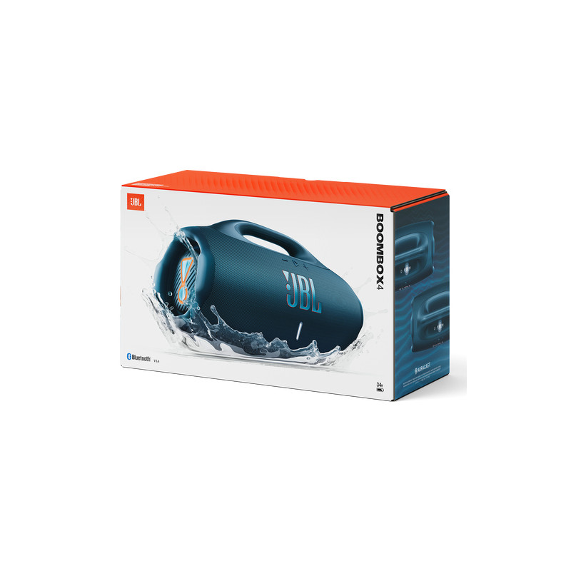 JBL Boombox 4. Diamètre de haut parleur aigu (impérial): 1,91 cm (0.75"), Diamètre de haut parleur aigu: 2 cm, Diamètre du woofer (impérial): 12,7 cm (5"). Puissance évaluée de RMS: 180 W, Gamme de fréquence: 37 - 20000 Hz. Technologie de connectivité: Sans fil, Profils Bluetooth: A2DP, AVRCP, Modulation d’émetteur Bluetooth: 8DPSK, DQPSK, GFSK. Type de produit: Orateur du parti, Couleur du produit: Bleu, Conception du produit: Cylindre. Utilisation recommandée: Universel