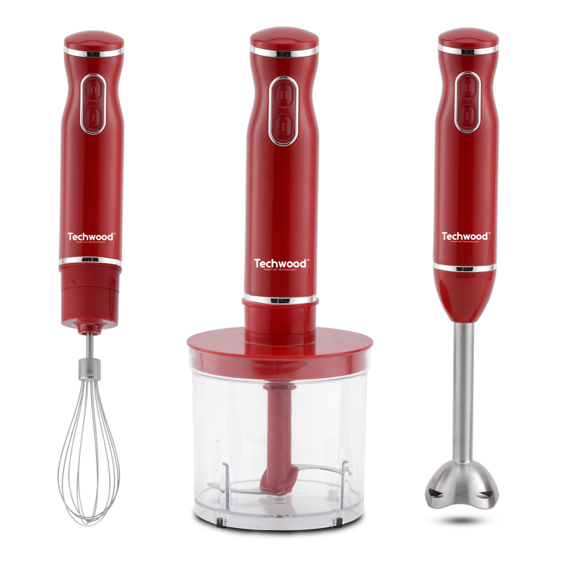 ENSEMBLE MIXEUR PLONCHEUR FOUET HACHOIR ROUGE 600W