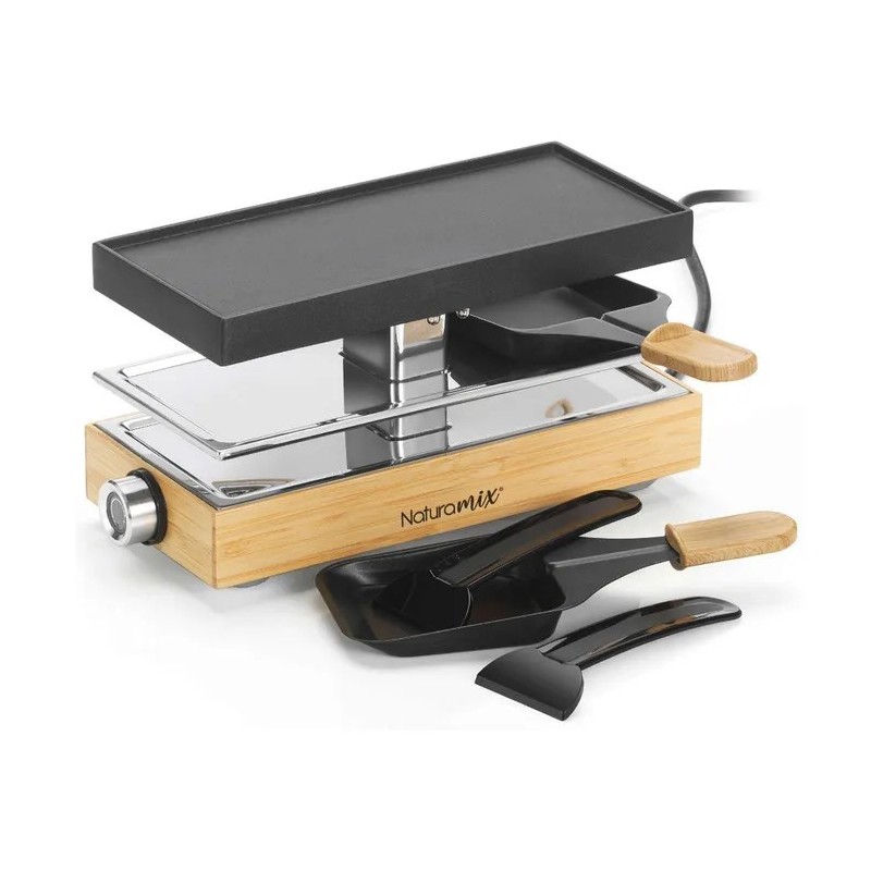 Naturamix Appareil à raclette 2 personnes 440w bois - RAC.WOOD-2 - Appareil à raclette naturamix rac.wood-2 pour un moment de convivialité ! appareil qui combine 2 fonctions dont fondre du fromage pour déguster une bonne raclette et des aliments cuits sur la plaque de cuisson. Doté de 2 poêlons avec revêtement antiadhésif résistant à une très haute température. Plaque de cuisson amovible, en fonte d'aluminium revêtue avec un revêtement antiadhésif.