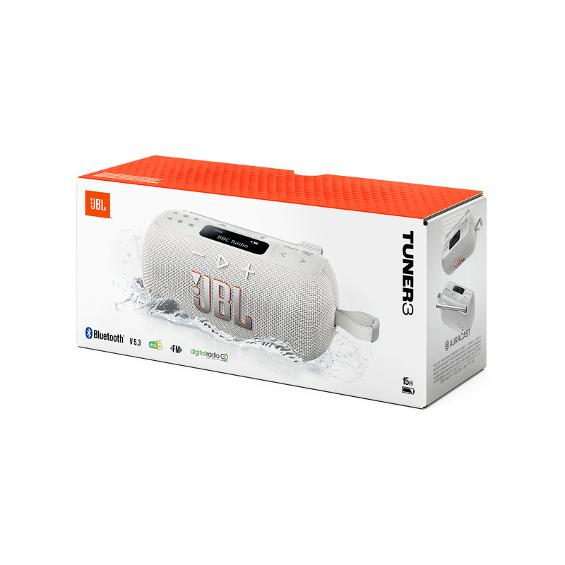 JBL TUNER 3. Radio: Portable, Type de tuner: Analogique et numérique, Type de bandes supportées: DAB, DAB+, FM. Puissance évaluée de RMS: 7 W, Gamme de fréquence: 70 - 20000 Hz, Rapport signal-sur-bruit: 80 dB. Type d'écran: LCD. Connecteur USB: USB Type-C. Couleur du produit: Blanc, Coloration: Monochromatique, Commande de volume: Boutons