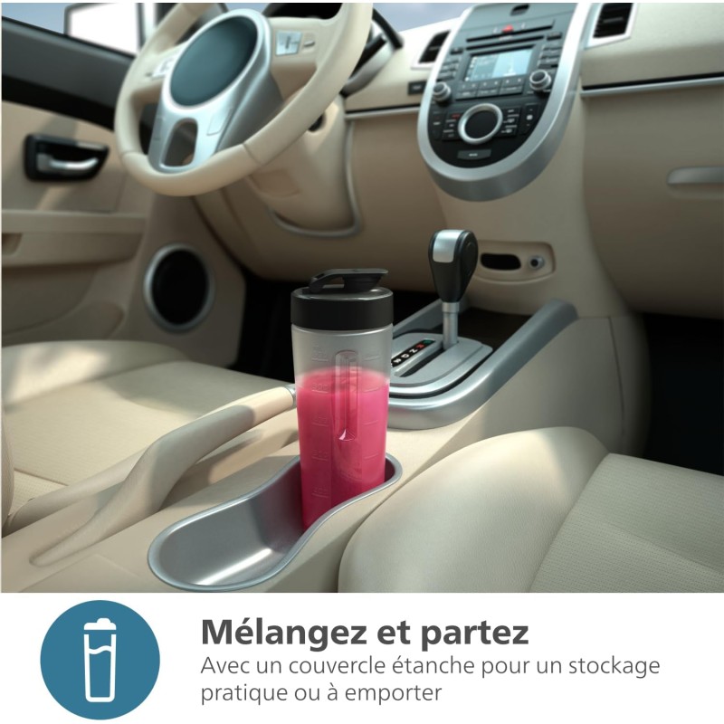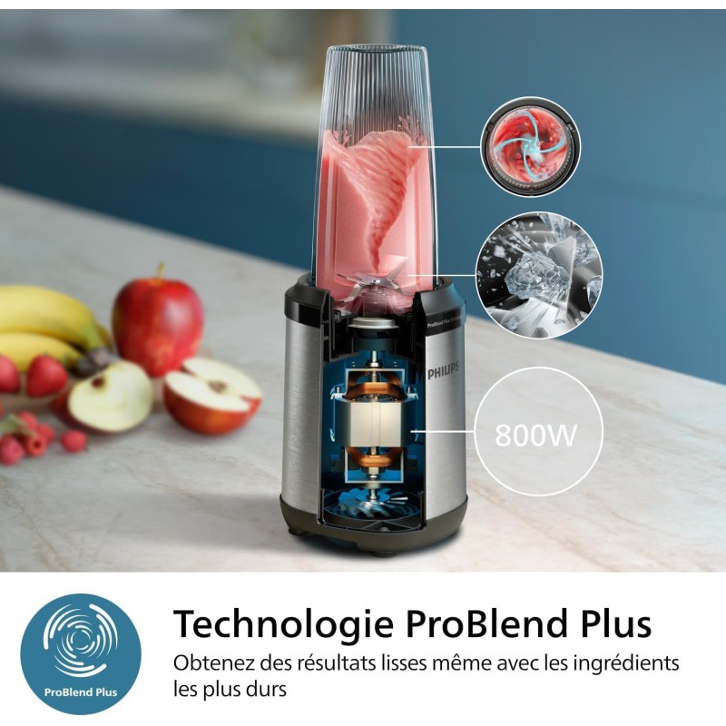 Enrichissez vos créations culinaires avec le blender Philips série 5000 d'une capacité de 0.7L. Le moteur ProBlend Plus d'une puissance de 800W fait circuler rapidement les ingrédients pour les mixer facilement. Aussi, dites adieu aux boutons et sélecteurs : il vous suffit d'appuyer sur la gourde et de tourner pour mixer sans effort avec notre blender smoothie. Le design compact et élégant de ce blender mixeur s'adapte à toutes les cuisines. Enfin, pour l'entretien, les pièces amovibles sont compatibles au lave-vaisselle facilitant ainsi le nettoyage !